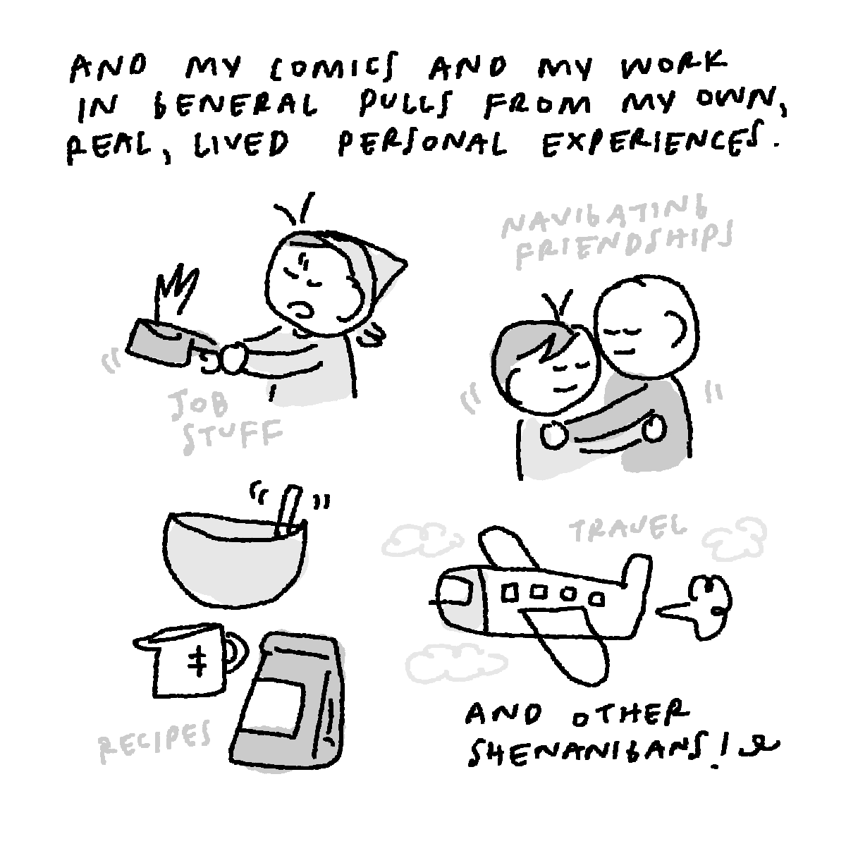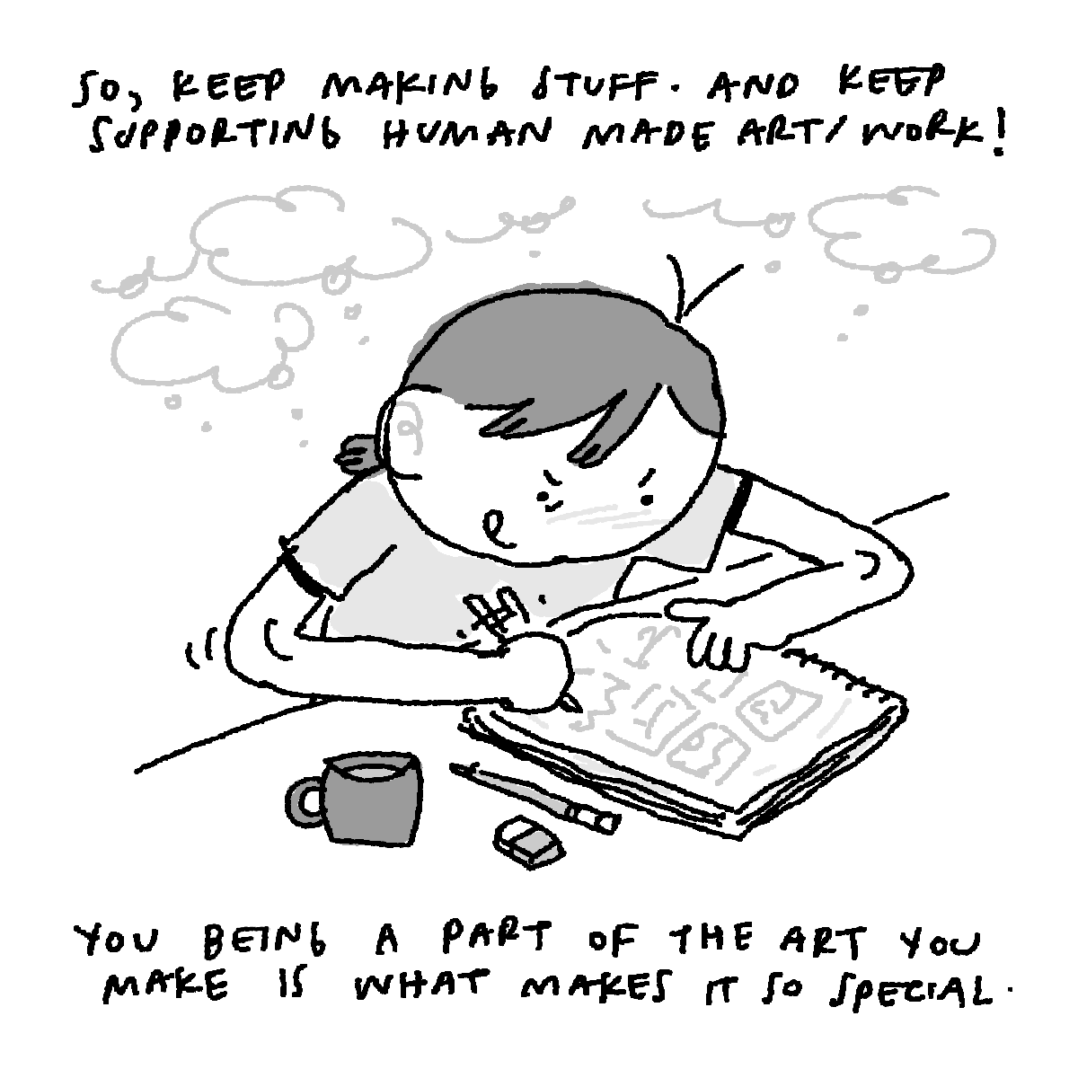 Again, I wrote this comic back in January initially, and the messaging of it has been ringing in my mind ever since. I went to SCAD for the Comic Arts Forum a little bit after drawing this (in Feb, covered in this newsletter post), and could not reiterate more that it’s so important for us to KEEP making stuff in this era of AI slop. AI “art” will never be better than us- because it has no soul. There is nothing personal or special about it for us to connect to and enjoy. What makes your work special is that it’s a culmination of your life experiences, the media you grew up with, the era we live in, the things you enjoy, etc. It’s special and unique to YOU. Because YOU made it. And what a privilege it is to celebrate and witness your creations and your story. So yeah, fuck AI! Keep making stuff, keep celebrating being human, and keep thinking for yourself.