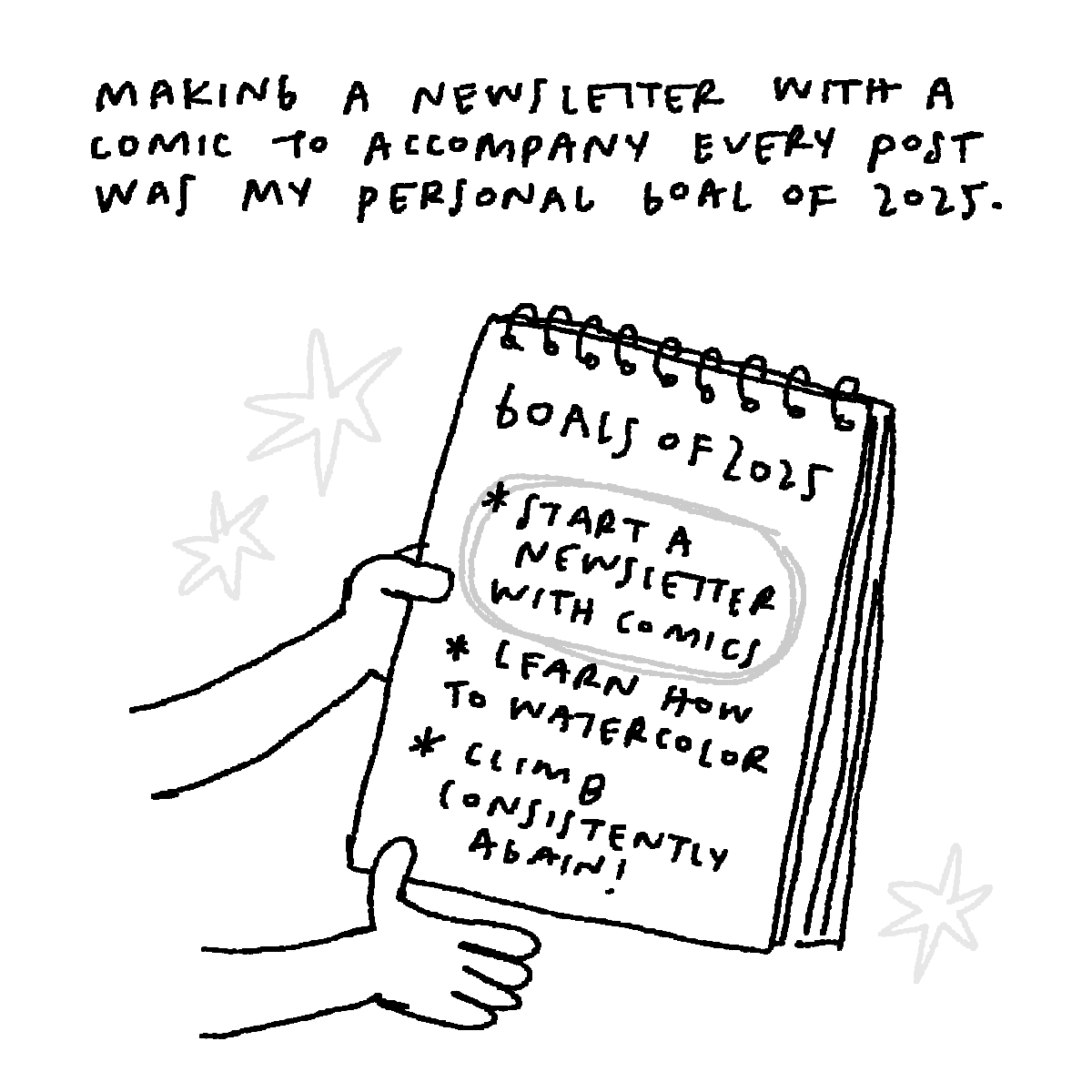 Happy belated one year to me keeping up with this newsletter (and making a ton of comics for it)!! Super stoked to have successfully executed my goal for last year and to also continue to make work that I can share with people- since most of the work I do I don’t actually share! Whether that’s the NDA work I’ve done or my sketchbook drawings. None of that really makes it into the public… so I’m glad to have art that I’ve made that I can share with people. :-)