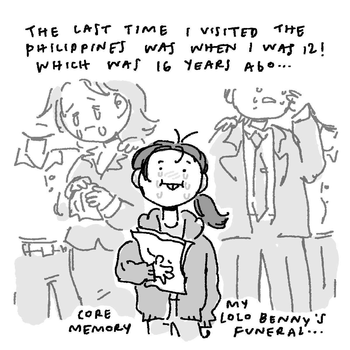 I also learned that my Lolo Benny worked in the city of Clark, I think for the military or something? Not like in the military, but for them. Clark was a former US military base, but now it’s just a big international hub with museums and casinos. Lolo Benny was one of my grandma’s siblings, so more of a great-uncle for me? I was born in America but was sent to the Philippines as a baby and came back before I had to go to school. My mom was a single mom and it made more sense to send me where our relatives are so they could help raise me. Lolo Benny was one of the people that took care of me- and people often said you could leave me with him with paper and pencil and I’d never be bored. He passed away on my last visit to the Philippines, 16 years ago. I always handed him a stack of my drawings when I visited, but I sadly didn’t make it in time that year. I was told they buried my drawings along with him, and while I cannot confirm or deny that, I want to believe that’s true. His wake and his funeral are one of the most vivid memories I have to this day. From the loose ground we walked on, the feeling of climbing up the hills to bury him, to the food we ate and the clothes I wore (namely a red hoodie). And of course, the wails of grief I heard, and the mourning I felt in my own little heart. I loved him so much.