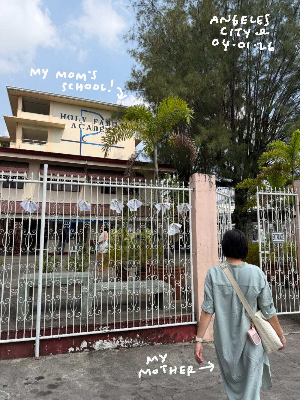 While we were in Pampanga, we stayed in Clark and rented two cars. My stepdad’s from Manila so he drove for us and my uncle drove for his family. I learned a lot about our family history since I was meeting more of my extended family, my mom’s friends, and visiting places they all grew up in. My mom’s friends drove us around one day and showed me the school they went to. We took lots of photos! Crazy to think they were in school there like 40 years ago. A lot has obviously changed since then, but they showed me the road they all used to walk down and the cafes that they used to frequent- and the Tollhouse cafe they went to as kids is still there!! They used to split 1 drink amongst like 3 of them haha.