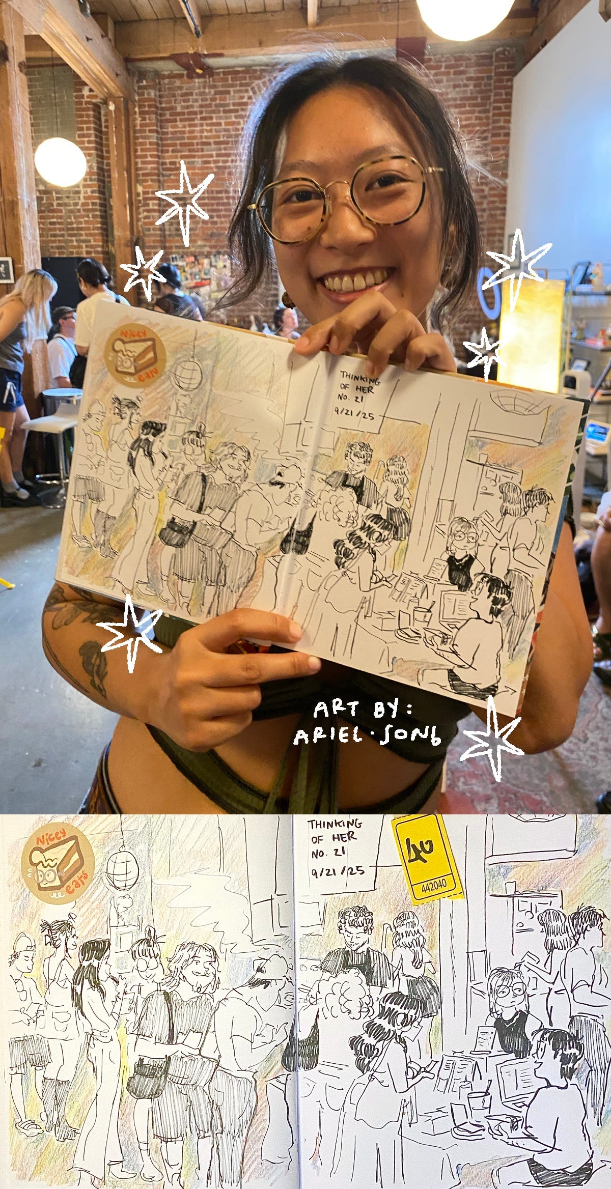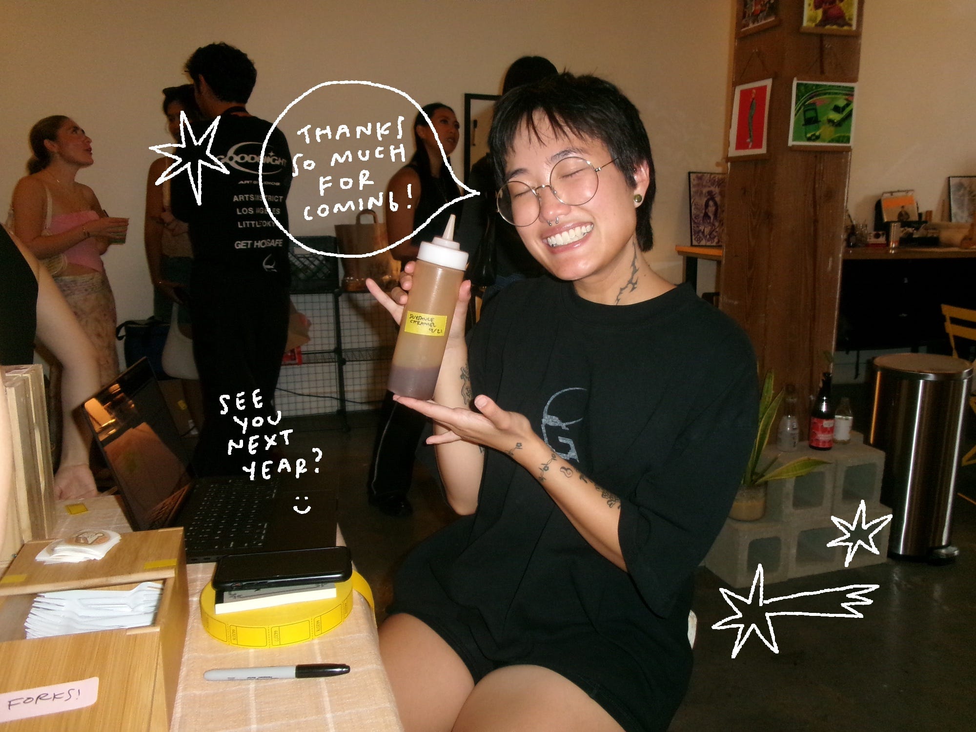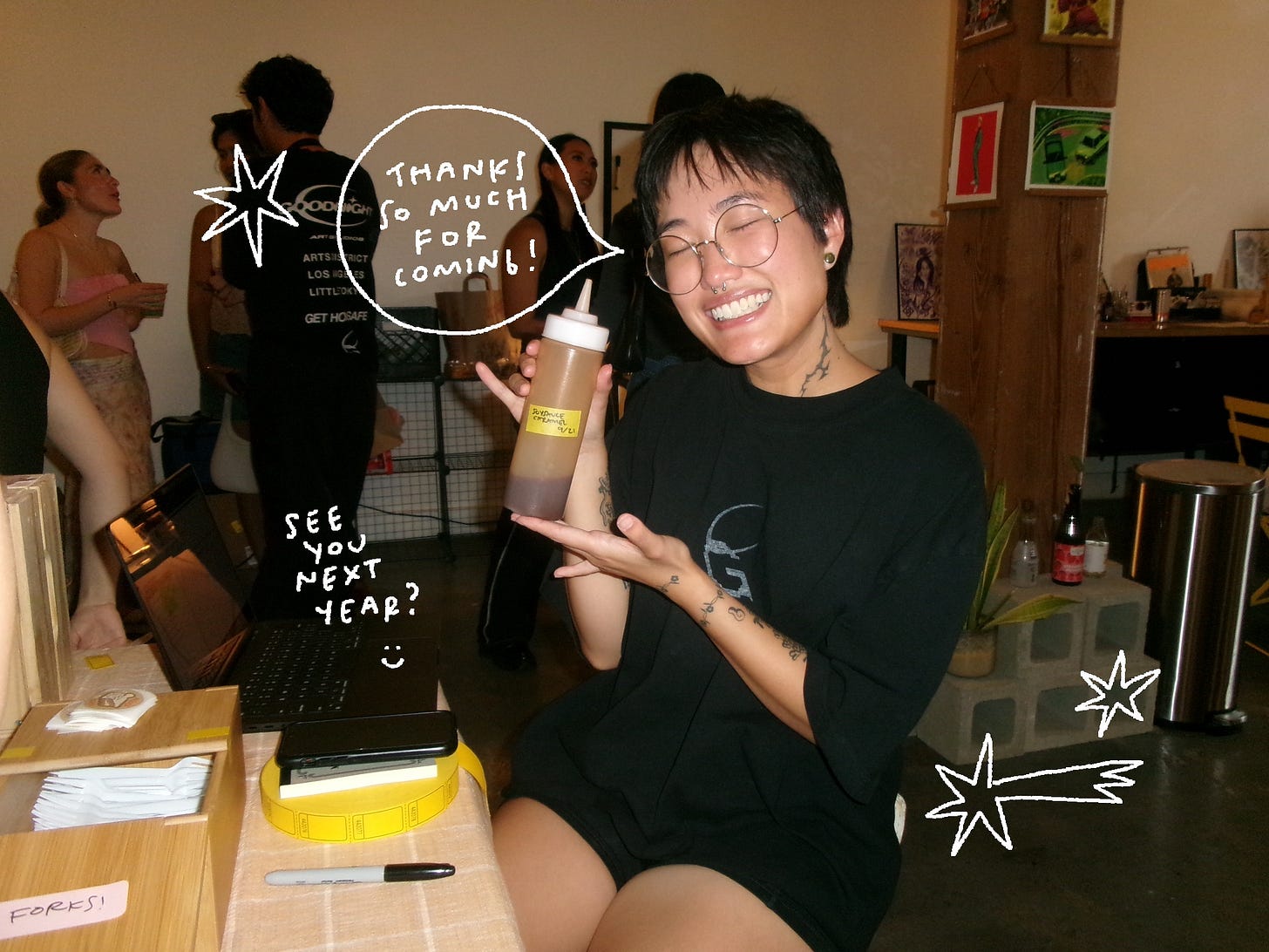 I worked in animation for like 4 or something years on like 3 shows previously and I mostly worked from home for all of it. I’m on a pretty short term project storyboarding at DTVA right now and it’s my first time really coming in frequently and taking up space in a cube (I’m hoteling lol) and seeing my coworkers and taking advantage of what the campus has to offer… It’s been SO nice. For one, it’s nice having some form of employment after a year and a half of riding the struggle bus. I say I was unemployed for a year and a half, but I did work in a kitchen for a bit (until hospital) and do a teeny tiny bit of freelance, and some odd jobs like being the door man for the Brokeback Mountain rerelease afterparty at Desert 5 Spot in collaboration with the queer line dance group Stud Country. Thank you Cley for hiring me for that! And of course, I’ve been working endlessly to do the popups and events and dinner service collaborations- just baking and working in a kitchen and generating an income kind of based off vibes. Things have been financially really rough the past year and a half is all I’m saying. On top of my health being absolutely bonkers. It still is!!! But I’m managing. And I’m extremely grateful to my director (THANKS DAVE!!) for bringing me onto this project and seeing some kind of potential in me to board again. And all the people that have been cheering me on and supporting me with all my projects (and my health problems). It means the whole world to me!!