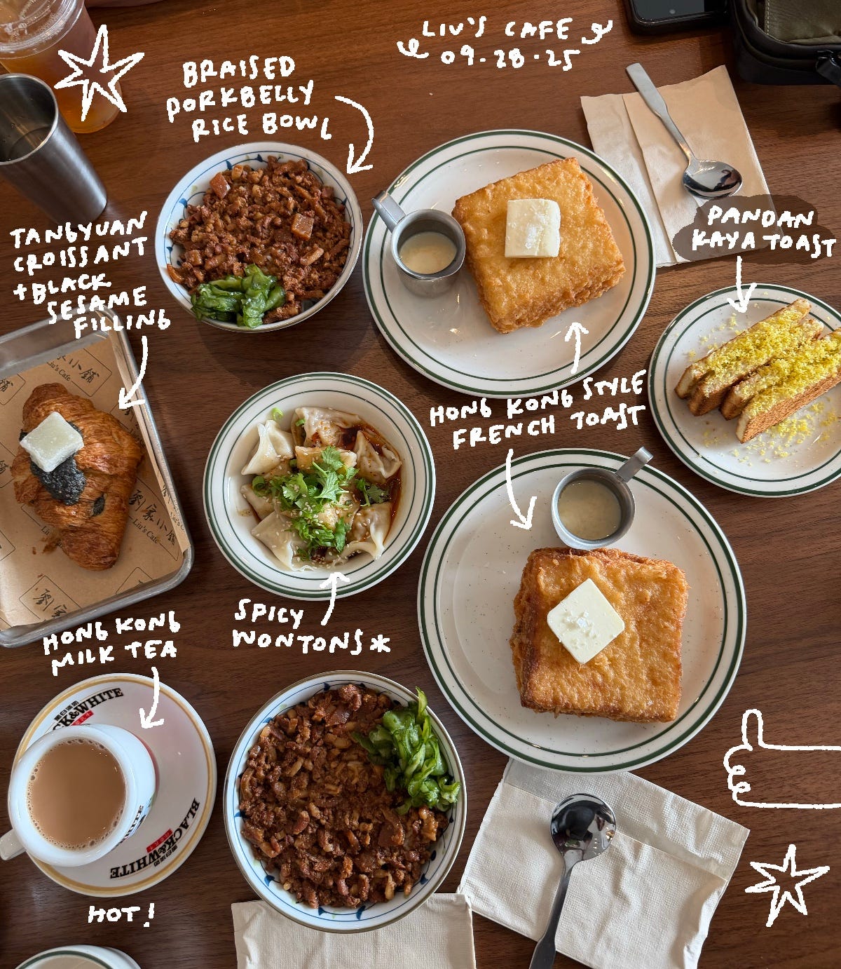 I took them to Jinsol Gukbap. Pork and sausage soup for me and my brother and my mom, leek pancake for the table, galbi tang for my dad, and cold noodles for Corey. Then we went to Wat Thai the next day after I spent the morning baking. BBQ skewers to share, duck noodle soup for my dad, hainan chicken for everyone else, some calamari for the table, more fishballs for the table, thai teas, and lots of dessert that I can’t even remember anymore. We ordered Daichan for dinner and brought it home and at around my tiny kitchen table. Daimyo chirashi for me and my brother, tuna poki soba for Corey, salmon steak plate for my mom, karaage bowl for my dad, agedashi tofu to share, garlic baby squid for me and my brother, and uhhh miso eggplant for the table. My usual order is actually the tuna poki soba- I always get it when I’m feeling down, and it always manages to make me feel better. And on their final morning, we went to Liu’s Cafe in ktown and had a feast of a breakfast. Picture with labels below. It took over an hour to sit our party of 5, which was kind of insane, so maybe don’t go if you’re a party bigger than 3. They closed down their ice cream annex and expanded the dining into that room, so in theory they have more seating… twice as much seating… but it’s still hard for them to sit bigger parties. And… then they were off! It was pretty pleasant, and I’d like for them to come visit again. Hopefully with grandma next time! My grandma’s also never seen my apartment or how I’ve been living all this time. I’d like to cook them all a meal someday. ^_^